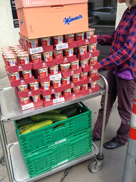 Vor wenigen Tagen holten wir eine beträchtliche Joghurt-Spende von der Firma Nöm AG. Die circa 2.500 abgeholten Joghurts, waren dann unter anderem in unserem kleinen eigenen ‚Gratis Lebensmittelmarkt‘ FAIRfügbar, welcher sich in unserem Vereinszentrum befindet und öffentlich zugänglich ist.