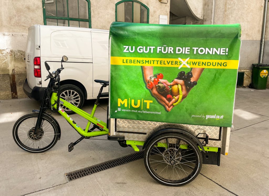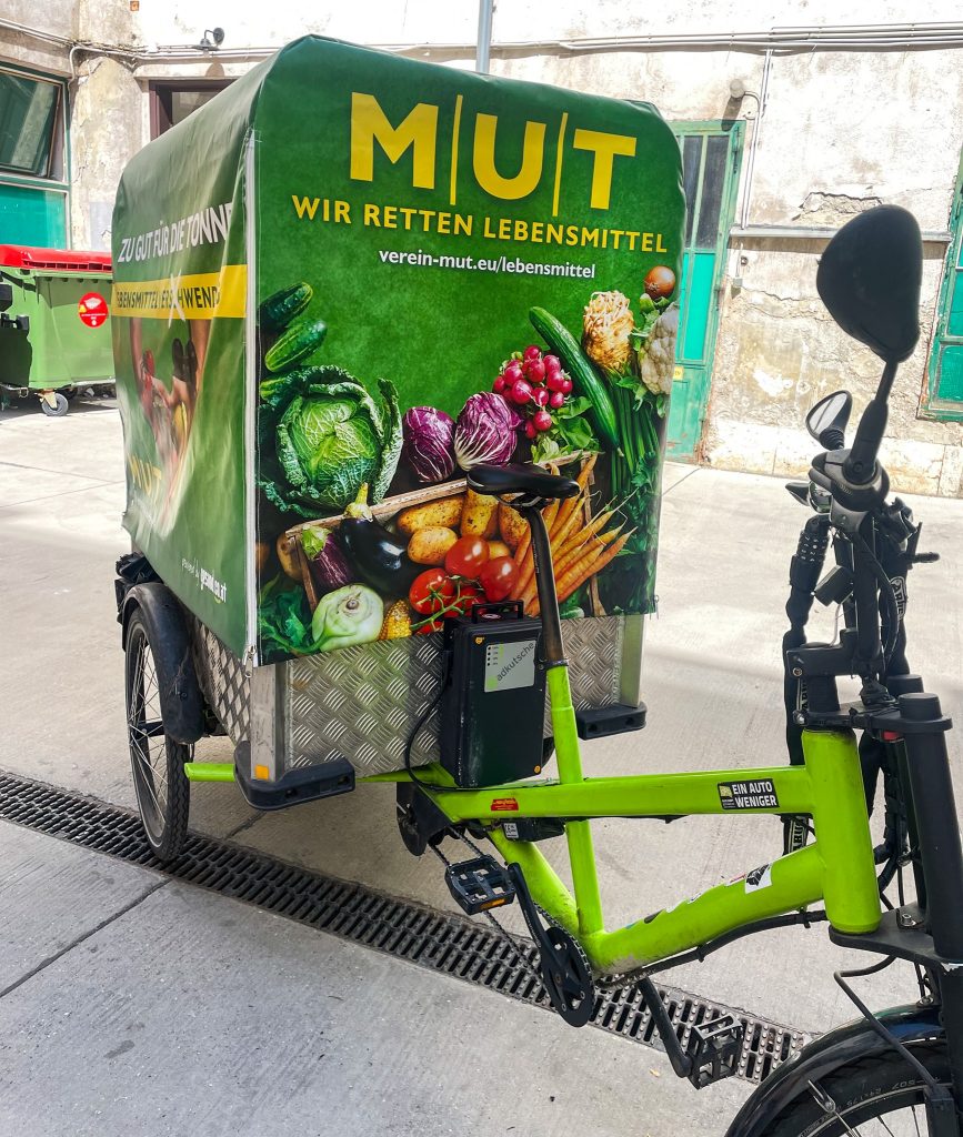 Ursprünglich gekauft wurde das Lastentaxi von gesund.co.at, die es Walter zur Verfügung stellen um eben genau das zu tun – Lebensmittel zu retten. Eine Zeit lang war er für eine andere Organisation unterwegs und nun freuen wir uns sehr, dass wir als Kooperationspartner näher zusammenrücken. Eine ganze Palette passt auf das grandiose Gefährt, das mit 300 kg. Lebensmitteln beladen werden kann! Und damit nichts nass wird oder aus dem Wagen purzelt, wird alles mit einer MUT Plane gut gesichert.