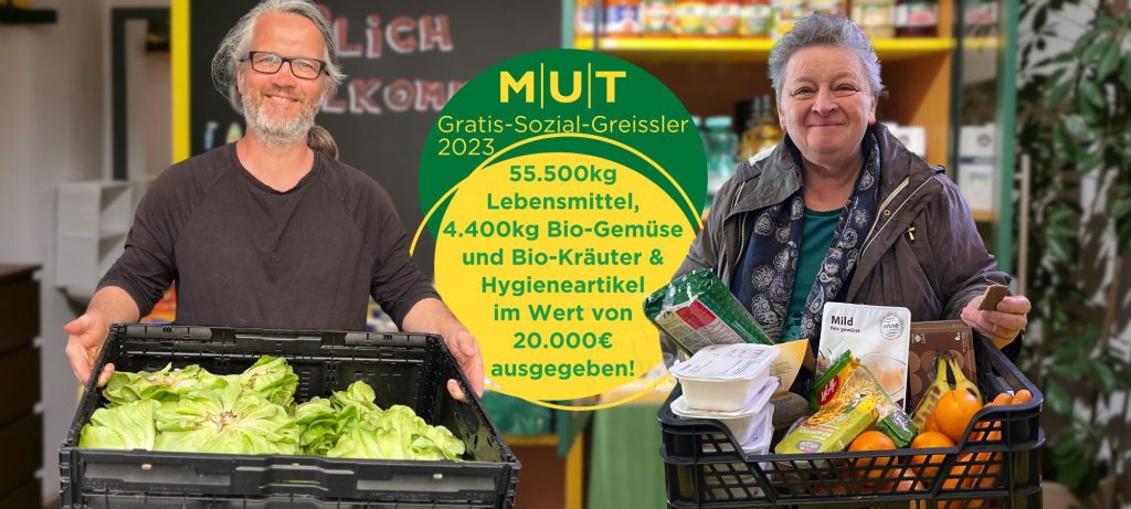 Insgesamt konnten wir in unserem Gratis-Sozial-Greissler im letzten Jahr 55.500kg Lebensmittel im Wert von 263.000€ und Hygiene- und Babyartikel mit einem Warenwert von 20.000€ an Menschen in akuten Notsituationen ausgeben.