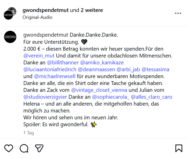 Gemeinsam – und natürlich mit allen neuen Gwond-Besitzer:innen – konnten so über 2.000 € an Erlös erzielt werden, die direkt in unsere Not und Obdachlosenhilfe fließen.
