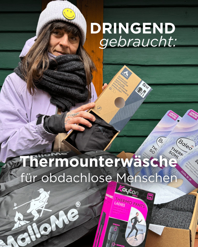 Besonders dringend benötigt wird aktuell Thermounterwäsche. Sie wird kaum gespendet, ist für Menschen auf der Straße im Winter jedoch von zentraler Bedeutung: Thermounterwäsche hält den Körper warm und trocken, schützt vor Unterkühlung und beugt Infektionen vor. Gerade für Menschen, die sich selbst und ihre Kleidung im Winter nur sehr eingeschränkt waschen können, ist sie ein unverzichtbarer Bestandteil der Grundversorgung.