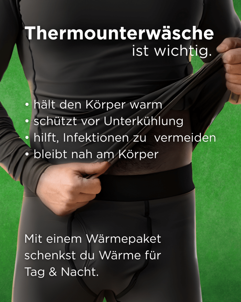 Um gezielt helfen zu können, kaufen wir hochwertige Thermounterwäsche zu. Mit einem Wärmepaket kann einem obdachlosen Menschen konkret und nachhaltig geholfen werden: