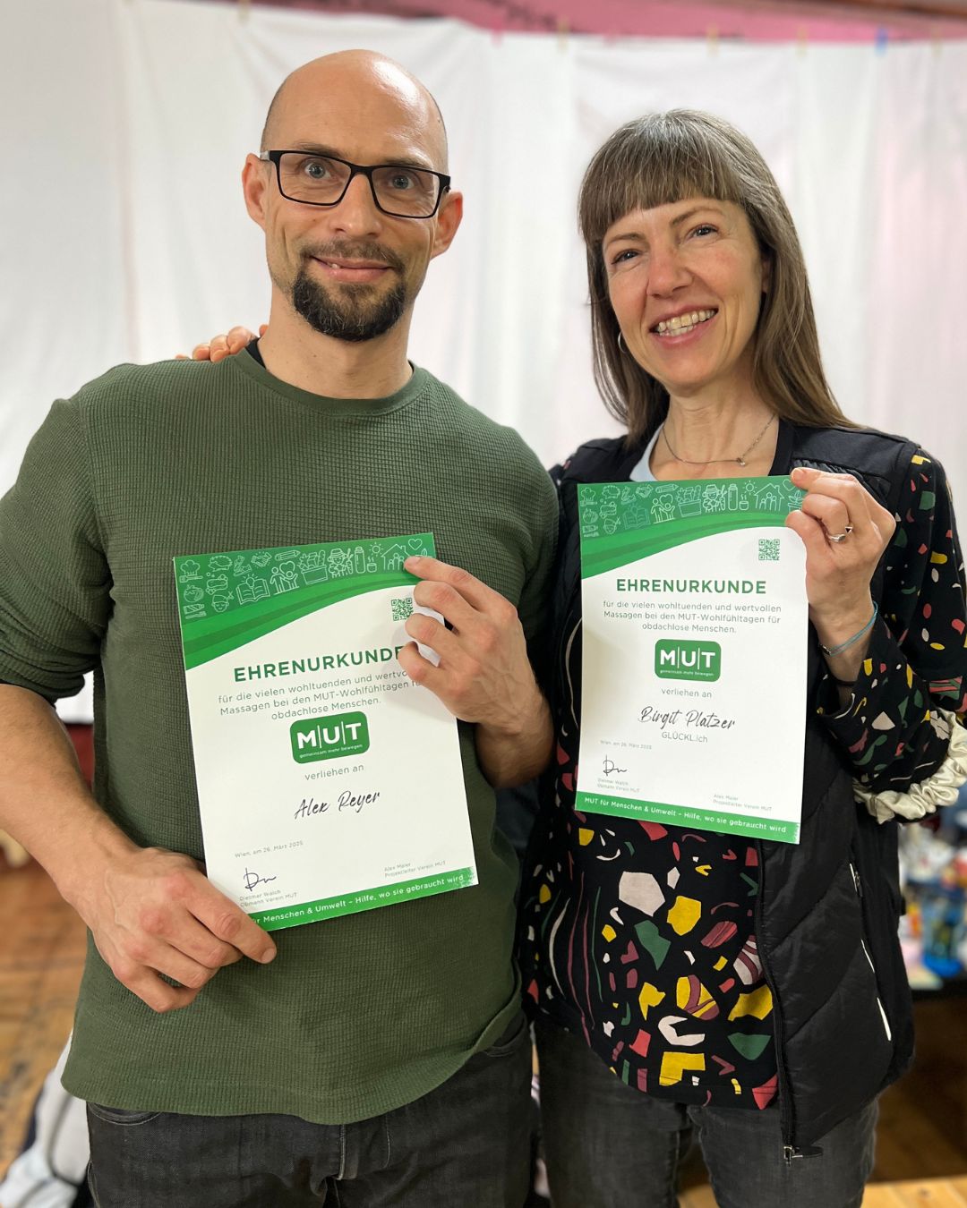 Für jeden gab es eine Massage und es entstanden sehr gute und persönliche Gespräche beim Zusammensitzen. Zudem konnten sich einige Teilnehmer:innen neues Gewand aussuchen, es gab Hygienetaschen und auch Sheltersuits. Als Masseur:innen waren Eva Hainzer und Birgit Platzer, sowie Alex Reyer ehrenamtlich im Einsatz. Die drei begleiten uns und unsere Wohlfühltage schon seit Jahren, dafür gab es diesmal auch eine Anerkennungs-Urkunde.