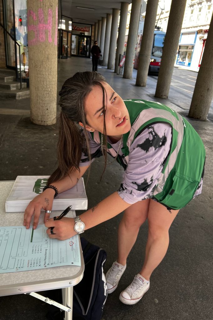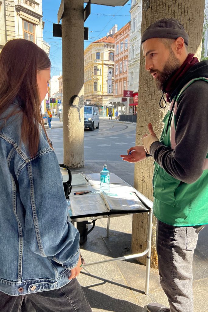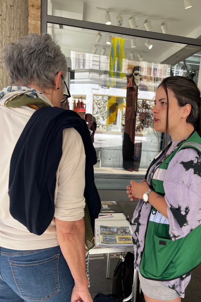 Egal ob Schneesturm oder brütende Sommerhitze, unser standhaftes Team der Öffentlichkeitsarbeit ist unermüdlich als Sprachrohr für uns unterwegs! Täglich kommunizieren sie unsere Tätigkeiten und Projekte und unseren Wert für die Gesellschaft an interessierte Passant*innen.