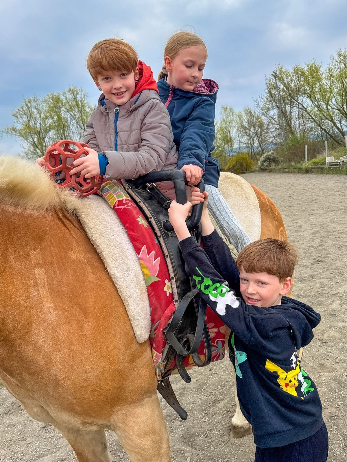Mittlerweile haben Linus, Kilian und Eliana gemeinsam mit Katrin Alma den Voltigiergurt angelegt und Kilian führt die Stute ganz selbstbewusst ins Freie und Richtung Reitplatz. Dort vollführt Eliana wahre Kunststücke. Sie steht am Rücken von Alma. Und auch die Buben fühlen sich auf Alma sichtlich wohl.