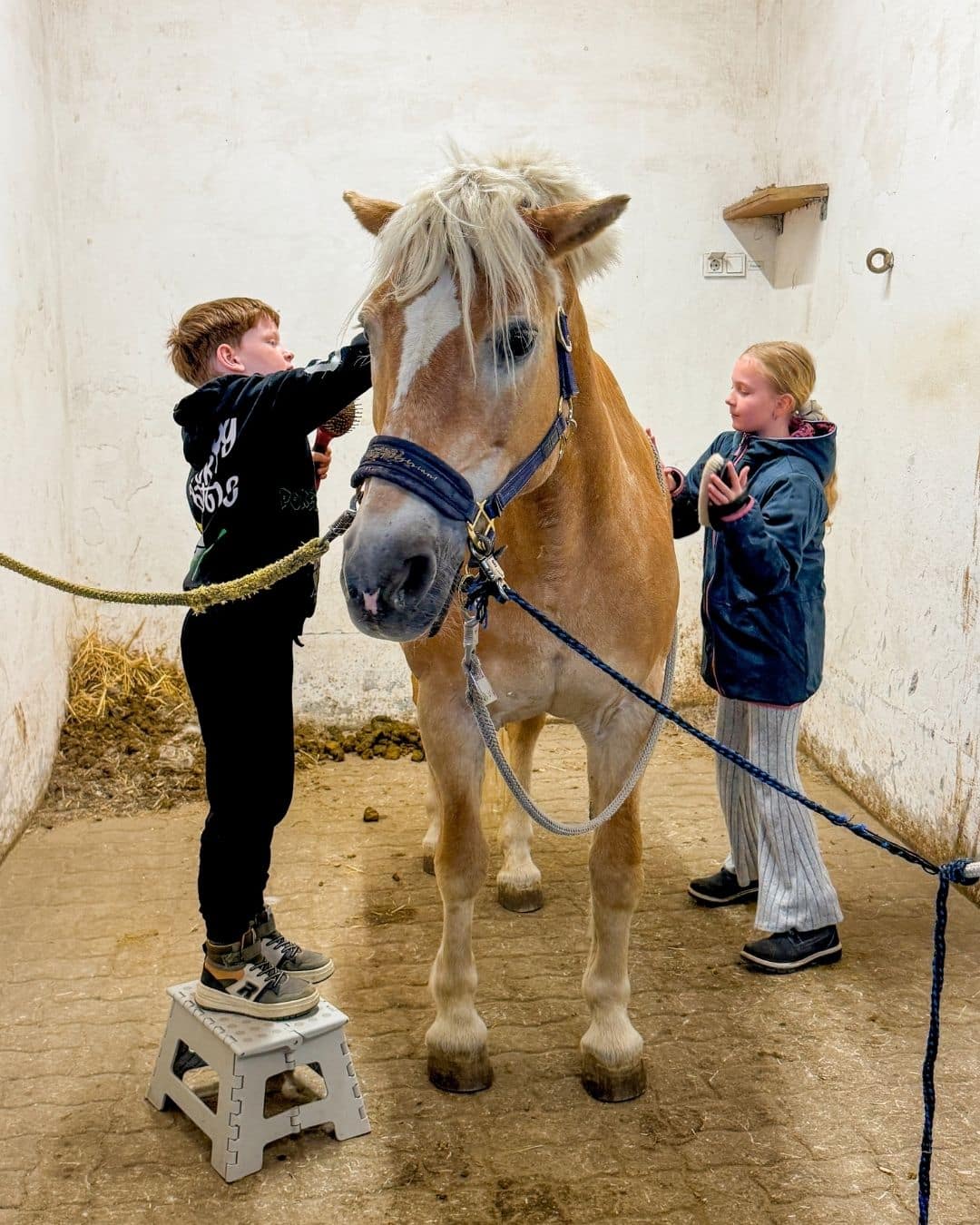 Ganz selbstverständlich gehen Linus (8), Kilian (7) und Eliana (10) zum Spint, holen Striegel, Bürsten und allerlei Pflegezubehör. Ein paar Meter weiter warten schon Alma, eine gutmütige Ü30-Stute und Reittherapeutin Katrin Bodendorfer. „Diese ähnliche, gleichförmige Bewegung ist immer der Start in der Reittherapiestunde, das holt die Kinder runter. Und es ist auch ein wichtiger Start für den Kontaktaufbau zum Pferd.”, erklärt Katrin. Sie ist gemeinsam mit ihrem Mann Mario die Gründerin und Betreiberin des Vereins Equi Novum in Maria Anzbach, wo sie unter anderem Reittherapien anbietet.
