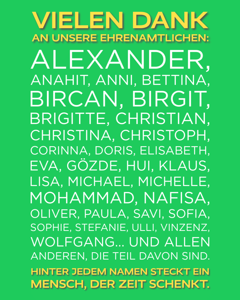 Die Größe der Namen im Bild ist ausschließlich dem Design geschuldet und nicht der Wertigkeit der Mitarbeit 😉 Alle genannten Personen sind von unschätzbarem Wert für das Gelingen unserer Projekte und für unsere Arbeit für Menschen und Umwelt.