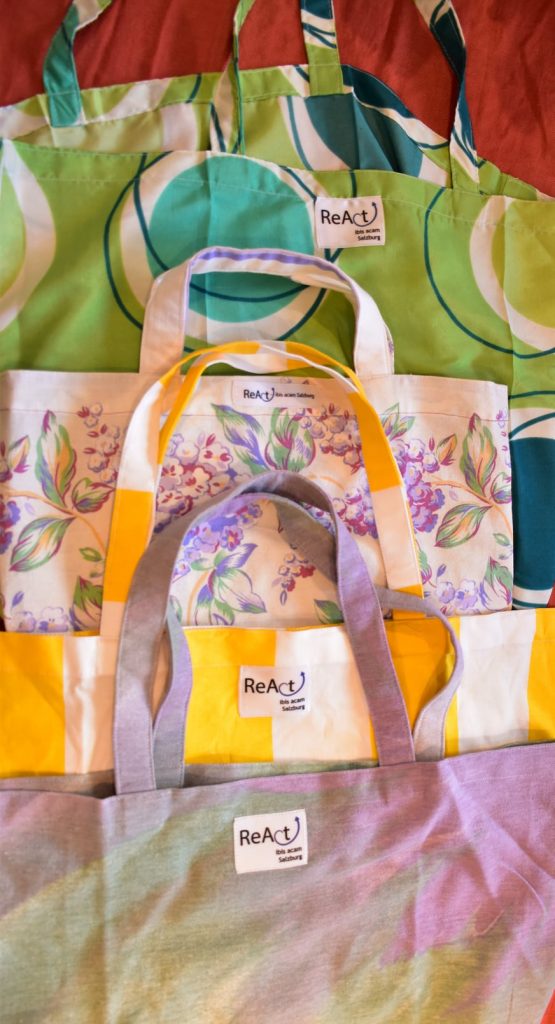 Das ReAct Werkstatt-Team ergänzt: „Die Teilnehmerinnen und Teilnehmer erwecken gebrauchte Materialien in Form von Taschen, Mützen, Schürzen und Boxen sowie Klein- und Kleinstmöbel zu neuem Leben. Die liebevoll upgecycelten Produkte finden in gemeinnützigen Einrichtungen ihre neue Verwendung.“