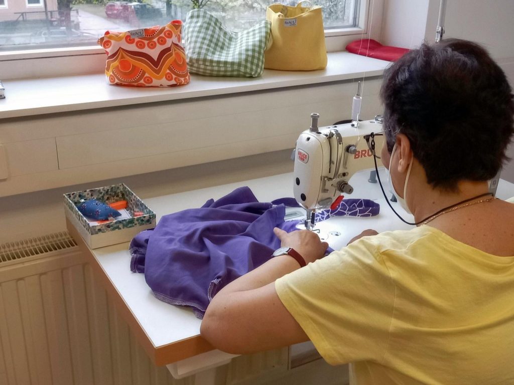 Im Falle des Kost-Nix Ladens werden gebrauchte Stoffe, die gründlich gereinigt werden, zu Taschen upgecycelt. Diese Taschen werden an die Besucherinnen und Besucher weitergegeben. So gelingt eine Kreislaufwirtschaft, die zukunftsweisend ist!