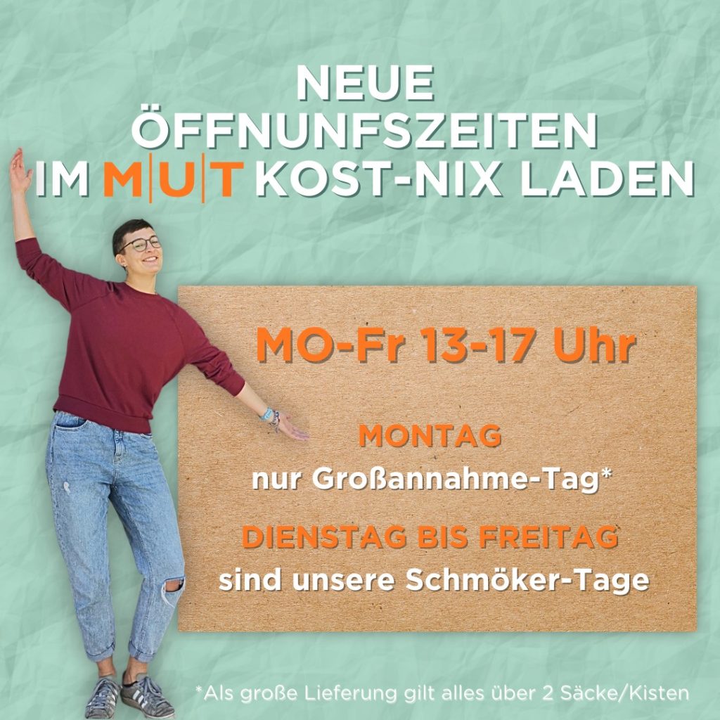 Wenn du mit uns dazu aktiv werden willst oder andere Ideen für Kooperationen hast, wir denken z.B. an Workshops im Kost-Nix Laden, melde dich sehr gerne bei Clara, der Leiterin des Kost-Nix Ladens per Email an salzburg@verein-mut.eu.