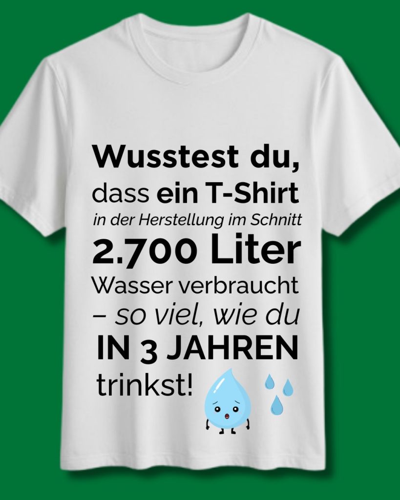 Wusstest du, dass die Herstellung eines T-Shirts im Schnitt 2.700 Liter Wasser verbraucht – so viel, wie du in 3 Jahren trinkst?