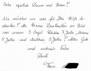 Daniela L. ist Mutter von 3 kleinen Kindern, dzt. noch in Karenz und hatte auf Grund mehrerer Sonderausgaben im September keinen Cent mehr für Essen übrig. Wir unterstützten die Familie mit Lebensmittelgutscheinen.
