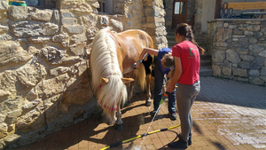 Danach gab es zwei Teams: Die Mädels säuberten zuerst den Stall und fingen dann mit der Pferdepflege an: Bürsten, waschen, Hufpflege