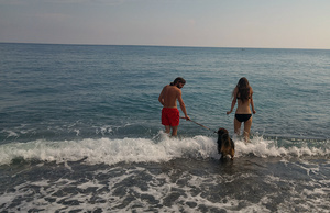kten Rucksäcke und los ging‘s zu den Autos, mit denen wir nach Borgo San Dalmazzo fuhren und dort in den gemieteten Bus stiegen, der uns zum großen Wasser führte. Die Busfahrt war sehr angenehm und das Gefährt war auch klimatisiert. Die Hunde waren auch superbrav. Nach etwa 3 Stunden kamen wir endlich an und sahen die ersten Palmen. Wir suchten ein Platzerl am Hundestrand, am anderen ist leider Hundeverbot. Nachdem wir es uns gemütlich gemacht haben, stürmten die Ersten schon zum Meer und hechteten hinein.