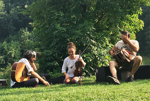 Nach dem Essen ging es dann nach draußen hinter das Haus. Dort setzten wir uns zu den anderen in die Wiese. Die Band musizierte und nach und nach erlernten wir die einzelnen Tanzschritte der Tänze. Das Tanzen machte Spaß, war aber auch anstrengend. René und Monika filmten das Szenario unabhängig voneinander mit. Alex und Andi engagierten gegen Ende dann noch die Band für unser Fest.