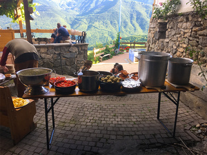 Am Freitag und Samstag waren die ersten beiden Arbeitstage, die wir in Prafiuret bestritten. Ab 8:00 Uhr gab es Frühstück, damit sich alle stärken konnten. Dann fuhr Alex mit Sonja und Lisa nach Lausé. Dort gibt es ein landwirtschaftliches Projekt der Gemeinde Demonte, bei dem alle mithelfen können, biologisches Gemüse anzupflanzen und zu pflegen. Am Ende dürfen sich die fleißigen Helfer von dem gezogenen Gemüse etwas mitnehmen. Derweil wurde in Prafiuret fleißig gearbeitet. Renè mähte den Rasen beim Haus. Das Essen wurde für den gemeinsamen Grillabend am Lagerfeuer vorbereitet. Salate wurden abgemacht, Fleisch und Fisch mariniert und eingelegt und Iris und Dani pflanzten den Basilikum um. Karin und Monika schrieben im Haus den Blog, der die tollen Erlebnisse festhalten wird. Danach war Siesta, die italienische Version der Mittagspause. Danach wollten wir langsam mit der Grillerei starten, doch der Himmel meinte es nicht gut, und es gab ein Donnerwetter, das uns einen wunderschönen Regenbogen bescherte. Somit mussten wir noch warten. Dank der optimistischen Bestellung von DANI ans Universum, zog das Unwetter weiter und wir konnten gemütlich beginnen. Das Essen, das von den beiden Grillmeistern Andi und Stephan vorbereitet wurde, schmeckte allen sehr gut und wurde draußen am Feuer verzehrt. Monika bekam ein eigenes Tischchen, das auch als Saucenablage diente.