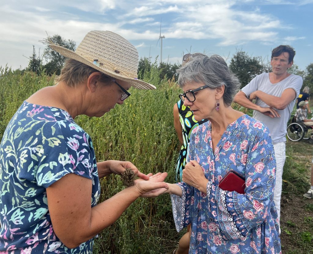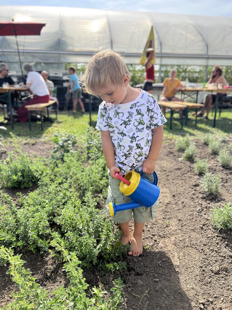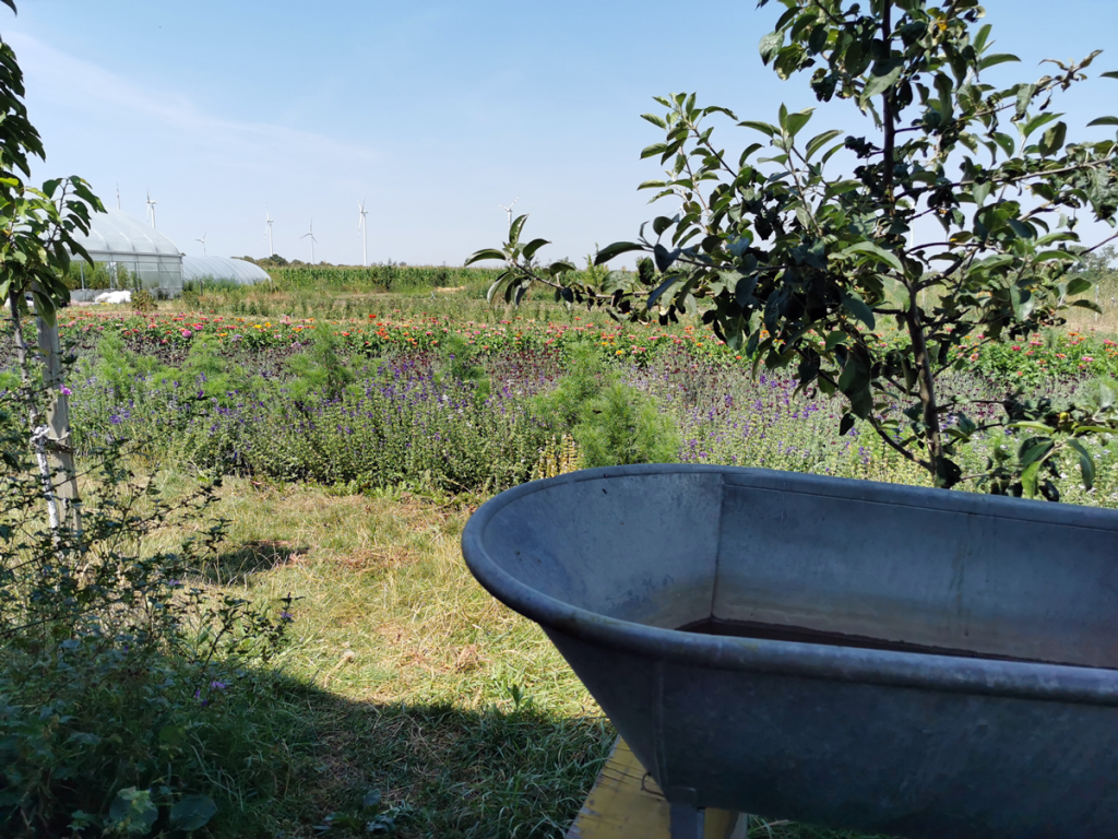 „Ich betreibe auf den Flächen von Ali und Andi eine kleine Biolandwirtschaft. Meine Schwerpunkte sind Physalis; Frischgemüse, das ich unter anderem beim Biohof Harbich anbiete; Gemüse- und Blumensaatgut für Reinsaat und Arche Noah; Ölsaaten, vor allem Sonnenblume zur Ölproduktion, zB Chiliöl; Blumen sind in Planung. Ein anderer Schwerpunkt ist die Anlage von einem Pflanzenlabyrinth, um einzuladen, sich auf den Weg zu machen, zur Mitte zu kommen, zu Sein. Mir ist es wichtig, dass mein Betrieb offen ist für Menschen, die kommen wollen – zum Tun, zum Kennenlernen, zum Austauschen, für Begegnungen!“
