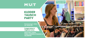 Bevor die Tage wieder mit heiteren Studieren vergehen, laden das MUT Kost-Nix Team und das Plus Green Campus zur bunten Kleidertausch-Party im Kost-Nix Laden ein.