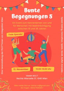 Einladung von Integration Wien: Liebe Interessierte, wir laden euch herzlich ein zu den Bunten Begegnungen, ein Event zum Kennenlernen von und für Menschen mit Beeinträchtigung